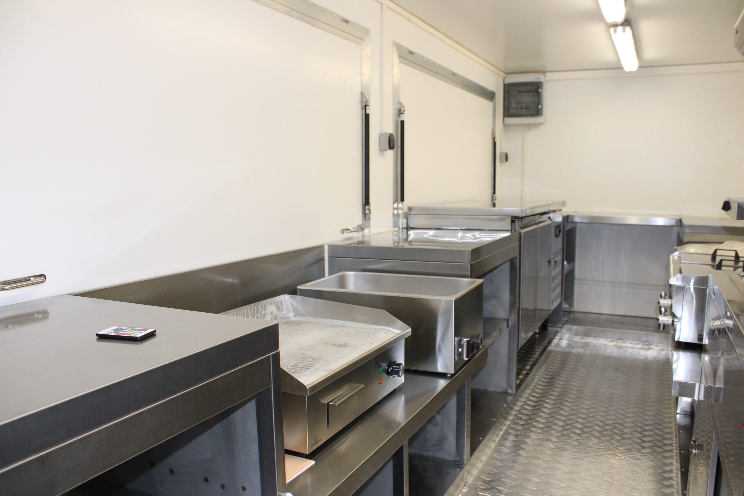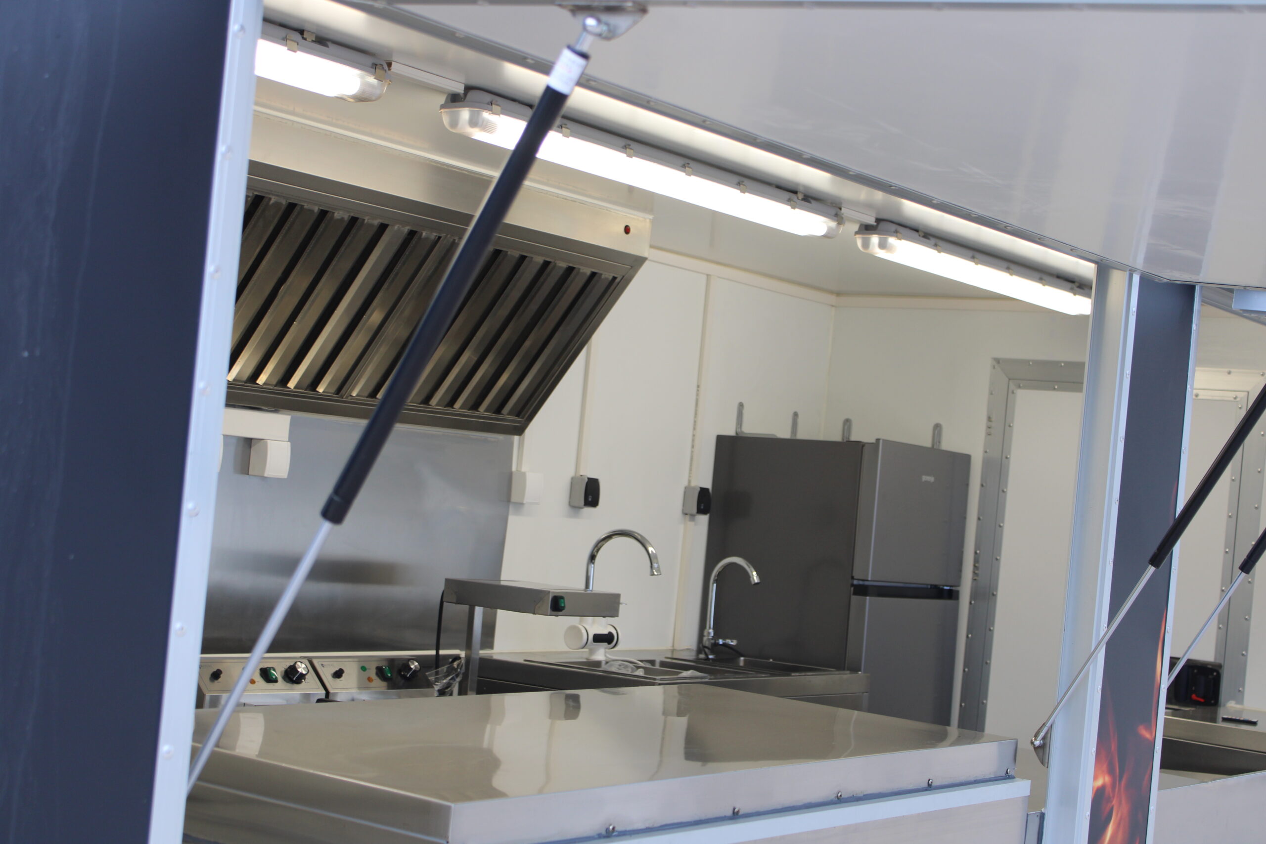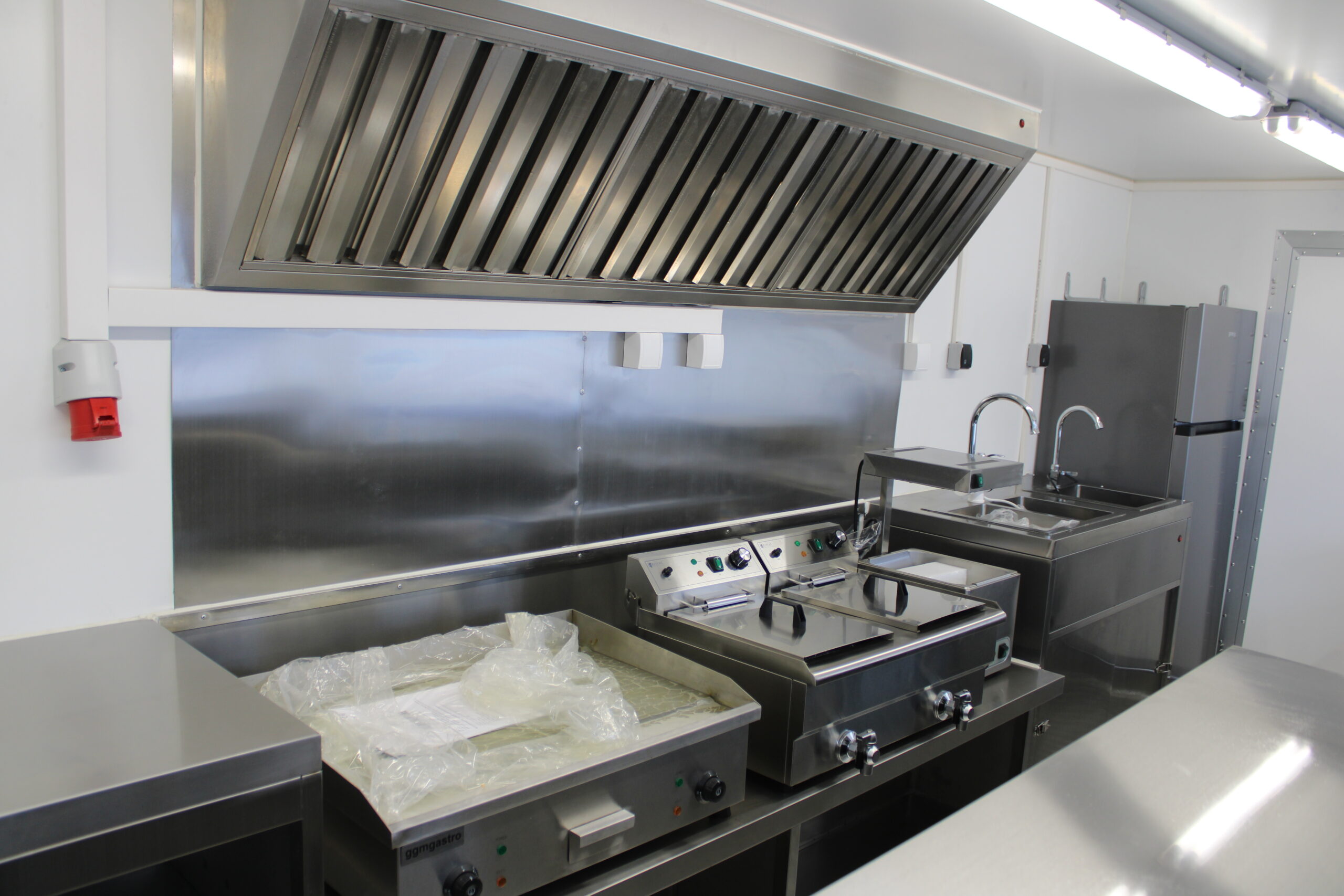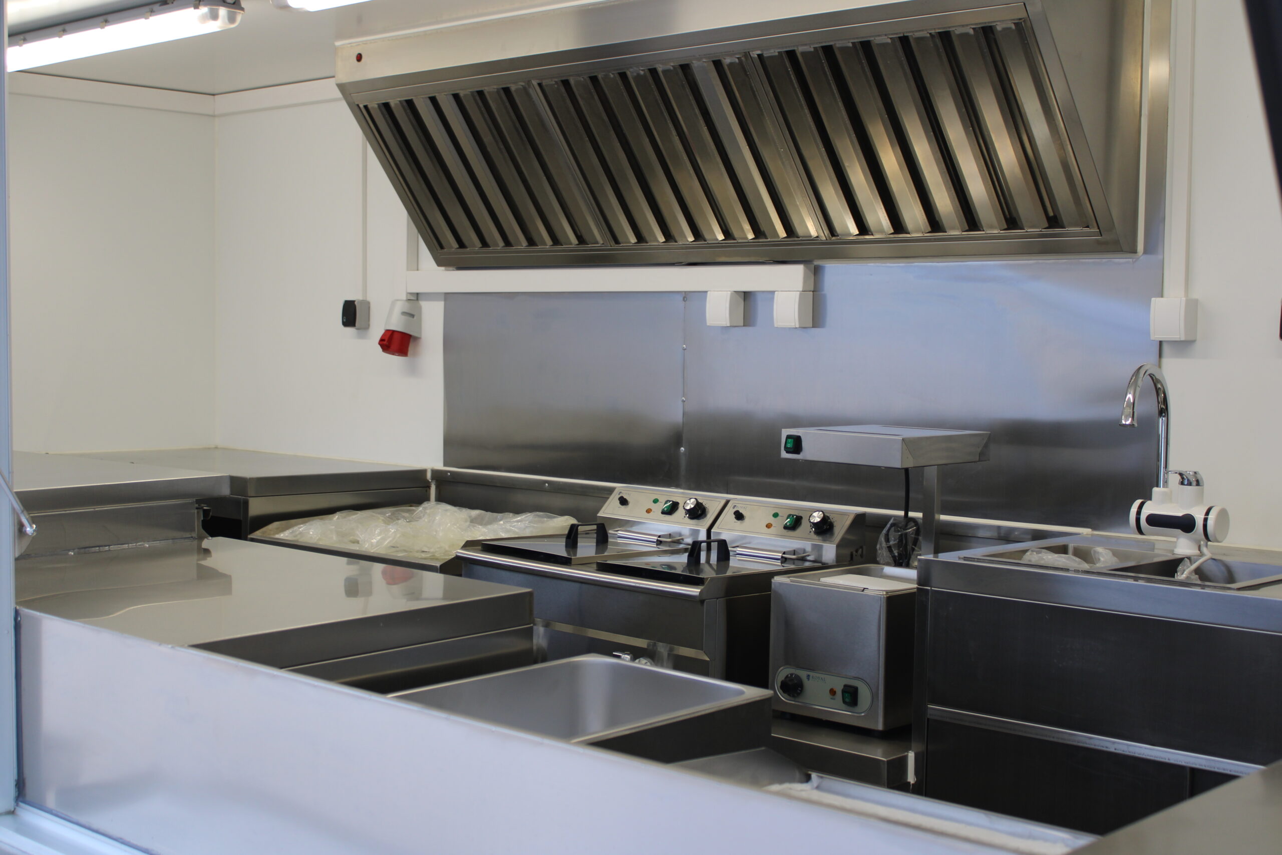 Der Ausbau umfasst eine Edelstahl-Verkaufstheke entlang der linken, rechten und hinteren Wand, Edelstahlseitenwände unter der Dunstabzugshaube, sowie abschließbare Eingangstür und möblierte Inneneinrichtung mit Taschenablage. Die Wasserversorgung ist durch drei Edelstahlwaschbecken mit zwei 40-Liter-Behältern und zwei Durchlauferhitzern gewährleistet. Ein Hygienepaket mit Seifen- und Papierspendern sorgt für die Einhaltung der Hygienevorschriften.