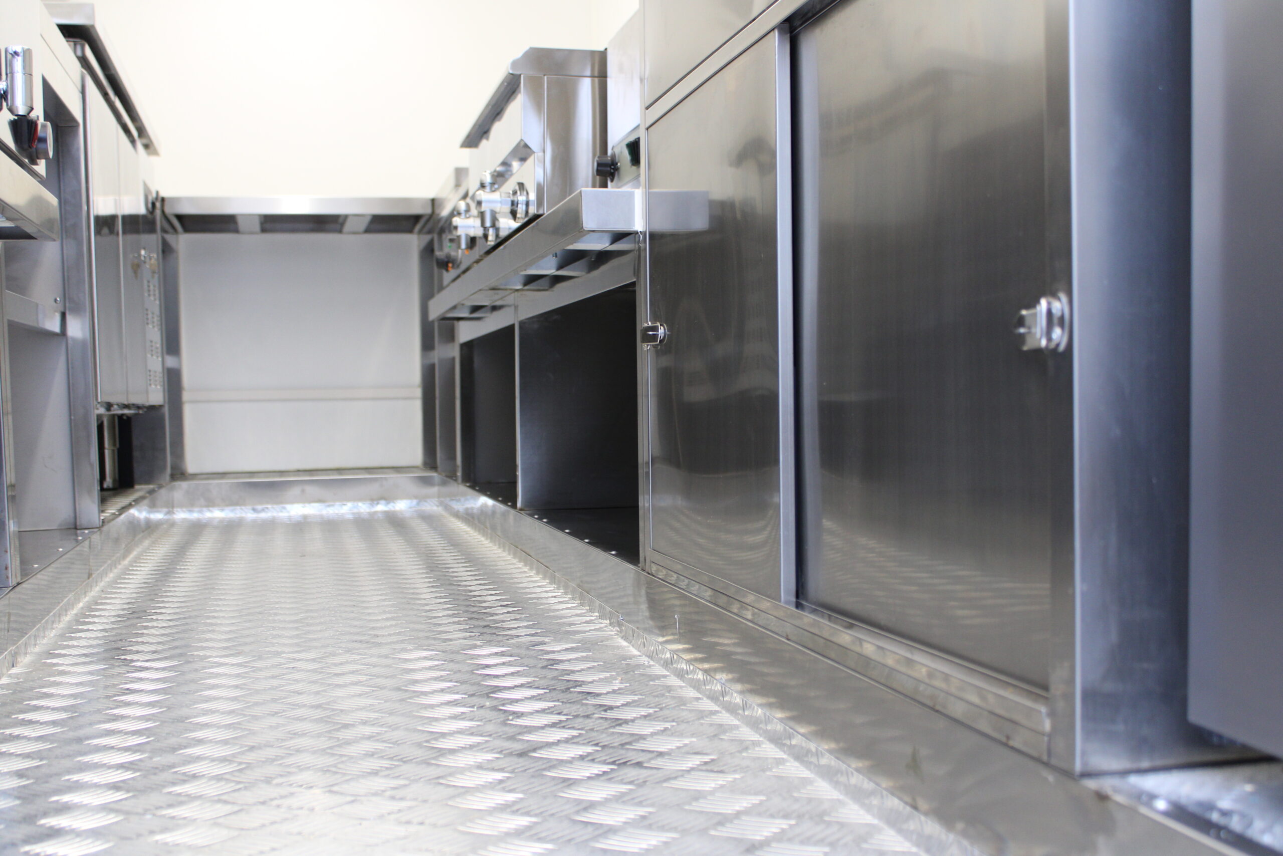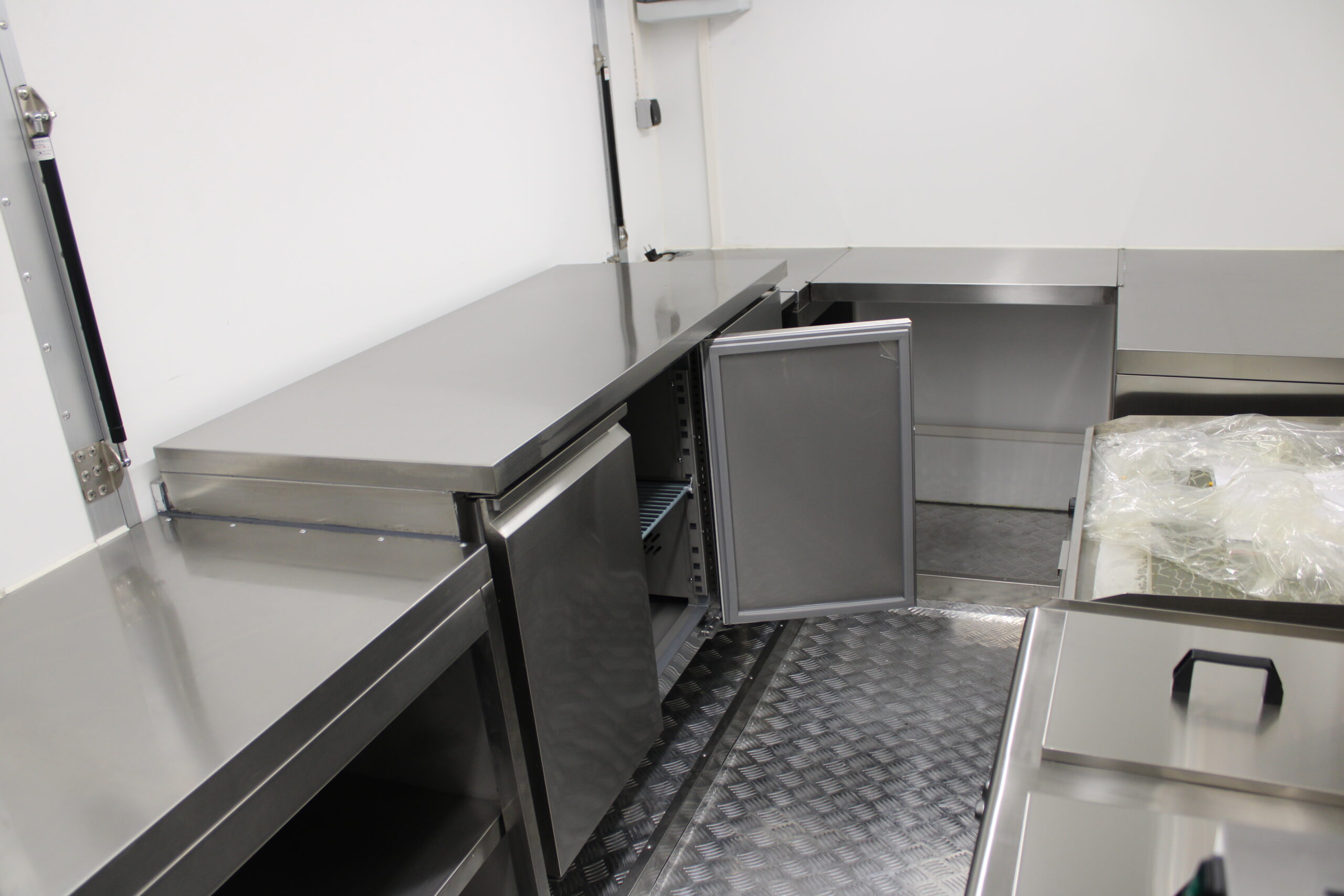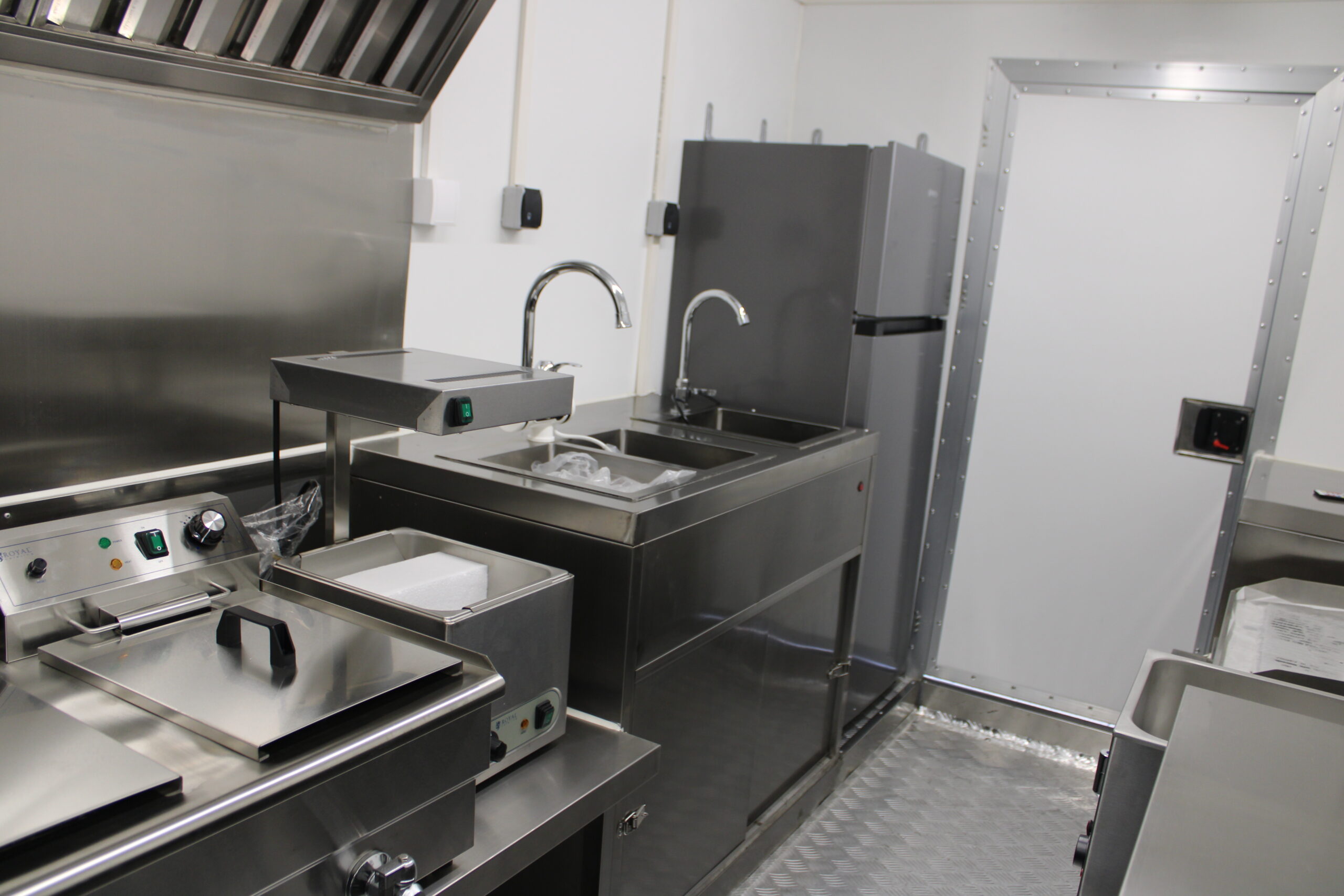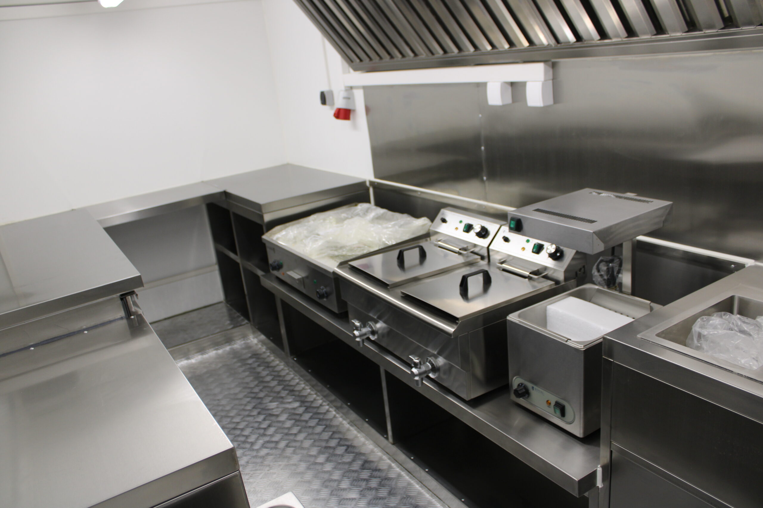 Der Ausbau umfasst eine Edelstahl-Verkaufstheke entlang der linken, rechten und hinteren Wand, Edelstahlseitenwände unter der Dunstabzugshaube, sowie abschließbare Eingangstür und möblierte Inneneinrichtung mit Taschenablage. Die Wasserversorgung ist durch drei Edelstahlwaschbecken mit zwei 40-Liter-Behältern und zwei Durchlauferhitzern gewährleistet. Ein Hygienepaket mit Seifen- und Papierspendern sorgt für die Einhaltung der Hygienevorschriften.