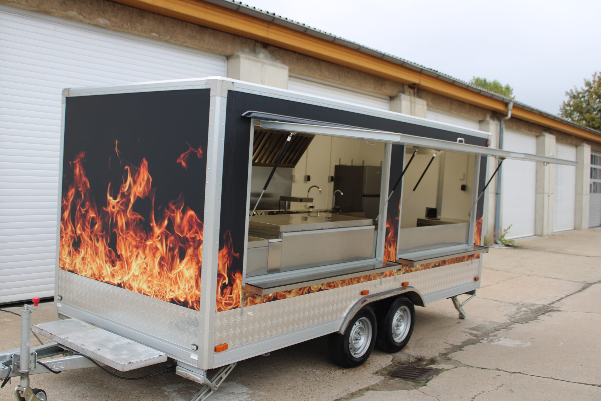 Dieser Imbisswagen bietet eine praktische und robuste Ausstattung für den mobilen Gastronomiebetrieb. Ausgestattet mit einer gebremsten KNOTT-Achse, einer Auflaufbremse mit Rückfahrautomatik und Feststellbremse sowie einer V-förmig verzinkten Deichsel, bietet er optimale Sicherheit und Stabilität. Die Innenmaße betragen 4800 x 1960 x 2000 mm, die Außenmaße 6330 x 2020 x 2060 mm. Zwei Verkaufsfenster ermöglichen eine flexible Kundenbedienung. Der rutschfeste Aluminiumboden sorgt für Sicherheit im Innenbereich und wurde erhöht, um die Reinigung zu vereinfachen.